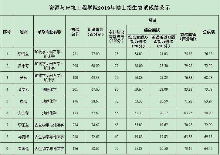 资源与环境工程学院2019年地质学博士点复试成绩公示