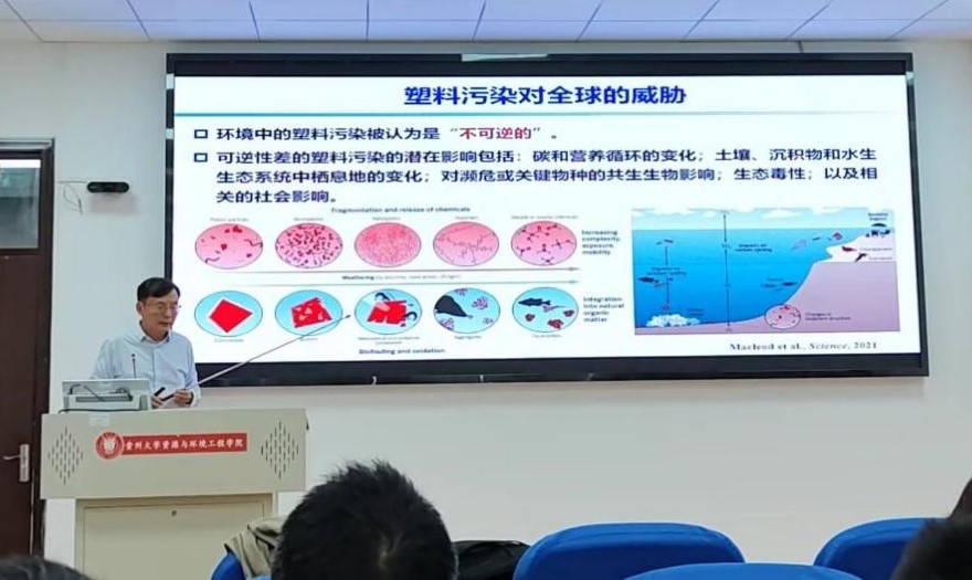 我院于4月26日在资环楼521报告厅举行学术报告会,特邀国家杰出青年科学基金获得者、基金委创新研究群体学术带头人、华南理工大学曾永平教授,做《微塑料研究进展与思考》学术报告,并展开交流。国际欧亚科学院院士、贵州大学副校长周少奇教授,暨南大学曾力希教授,学院教师代表以及硕士生、博士生,共计80余人参加交流,学术报告由喀斯特地质资源与环境教育部重点实验室(贵州大学)副主任、资源与环境工程学院副院长吴起鑫教授主持,周少奇副校长致辞。